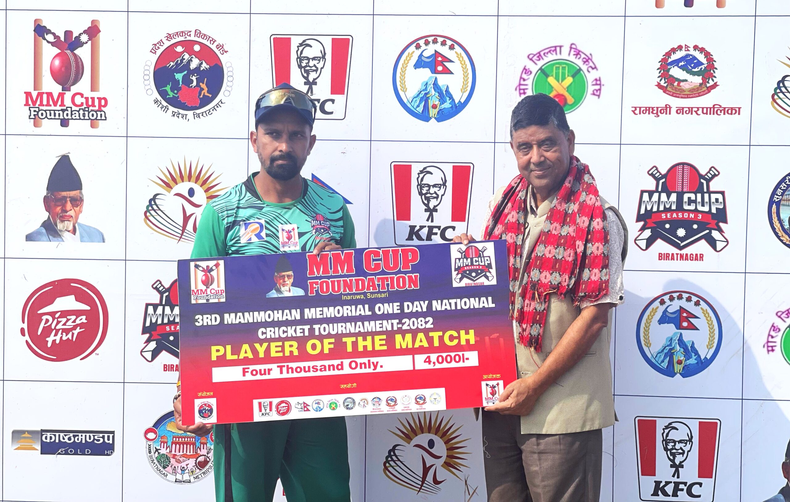 बिराटनगरमा जारि एमएम कप एकदिवसीय राष्ट्रिय प्रतियोगिता अन्तर्गत बुधबार सम्पन्न खेलमा भारतको आसाम क्रिकेट क्लबले जित दर्ता गरेको छ।
